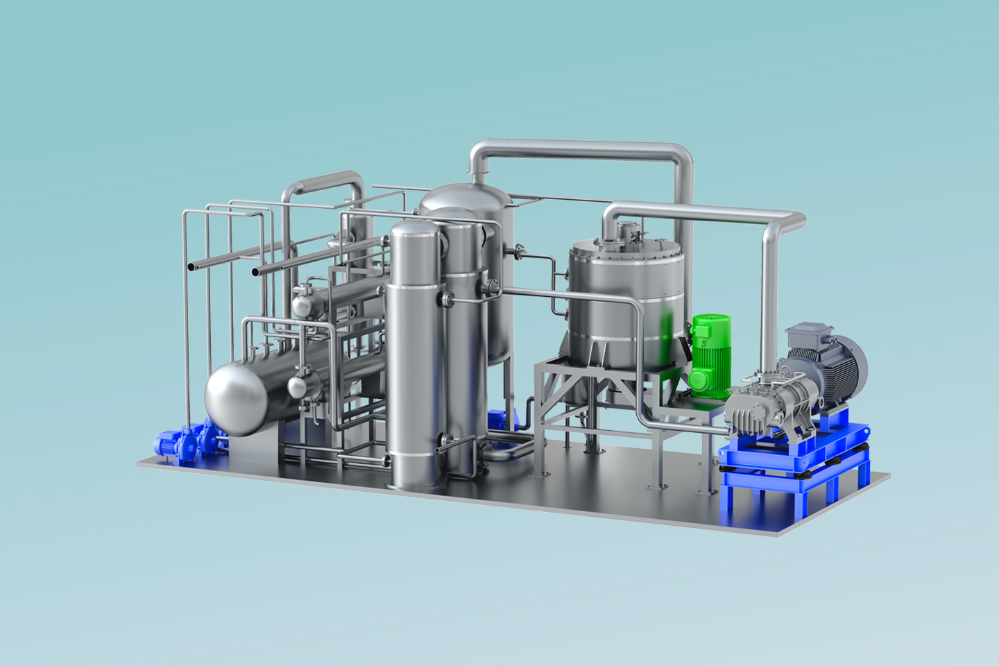 MVR熱泵精餾系統(tǒng)以高效旋轉(zhuǎn)精餾床為基礎(chǔ),利用離心力場代替重力場,強化相與相之間的相對速度和相互接觸,通過強化傳質(zhì)傳熱來提高分離效率縮小設(shè)備體積。 通過在系統(tǒng)中引入適用于小流量、大壓比的螺桿式蒸汽壓縮機(jī),即可實現(xiàn)MVR循環(huán)熱泵精餾。